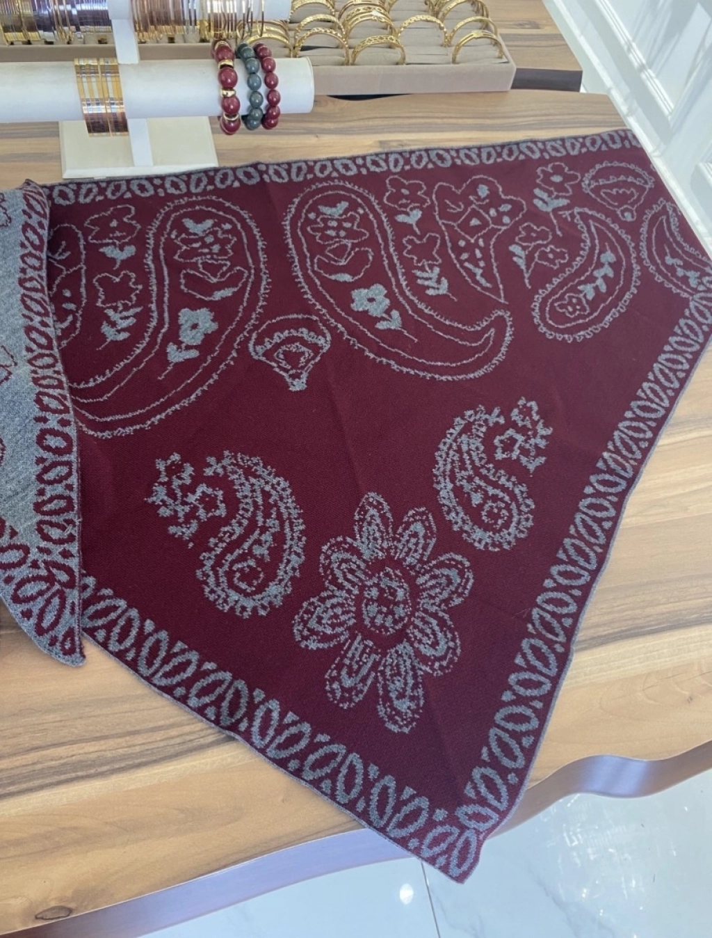Çift Taraflı Etnik Desen Bordo-Gri Üçgen Şal