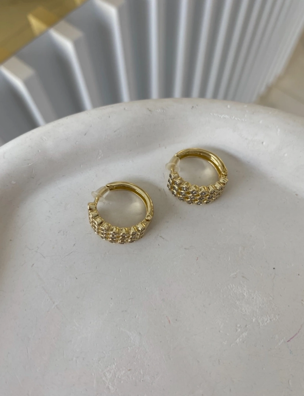Özel Seri Üç Sıralı Zirkon Taş KüpeRenk: 14K Gold Renk Ölçü: 10 Kuruş.